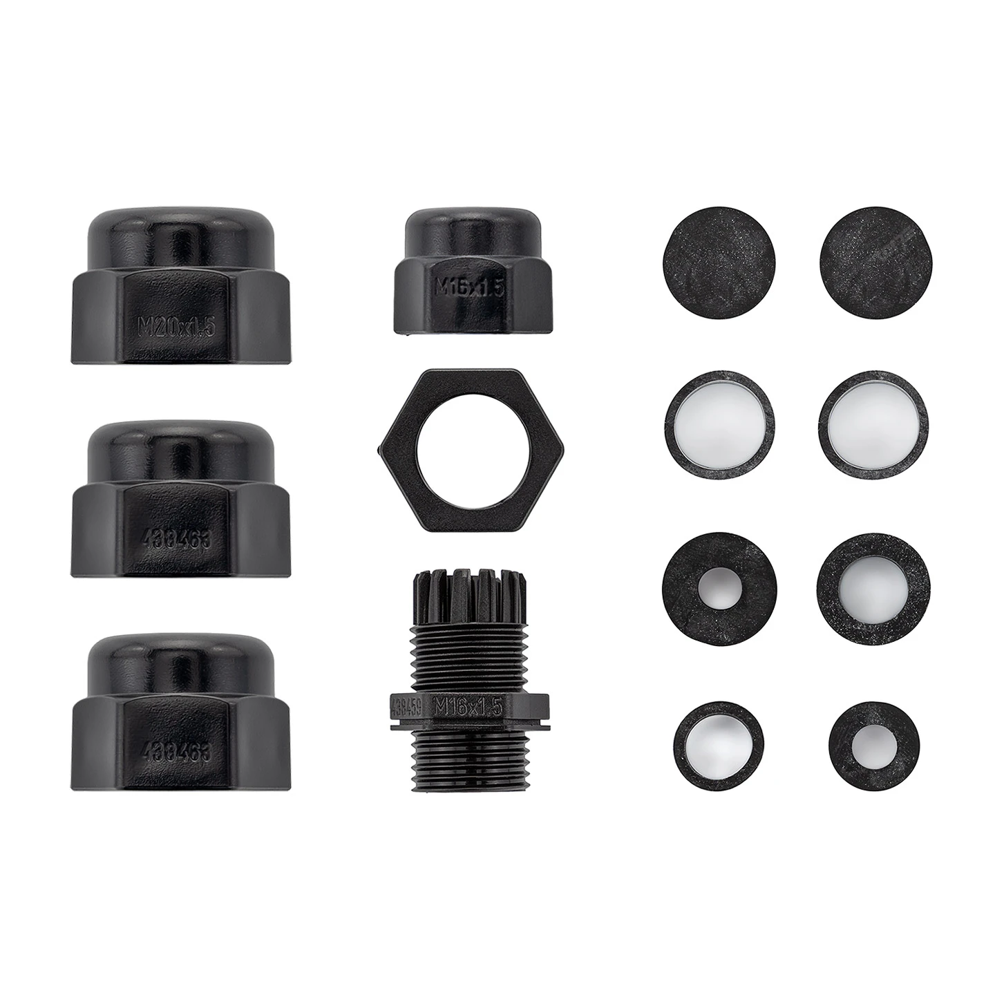 Es handelt sich bei diesen Verschraubungen um M20-Kunststoffmuttern, die von außen auf die Ausgänge passen. Weiterhin sind in diesem Ersatzteileset verschiedene Dichtungen enthalten, durch welche die jeweiligen Leitungen gezogen werden. Korrekt eingebaut sorgen Muttern und Dichtungen dafür, dass keine Feuchtigkeit über die Kabel eindringen kann. Die zusätzlichen Stopfen dienen dazu die Ausgänge bei Nichtgebrauch zu verschließen.